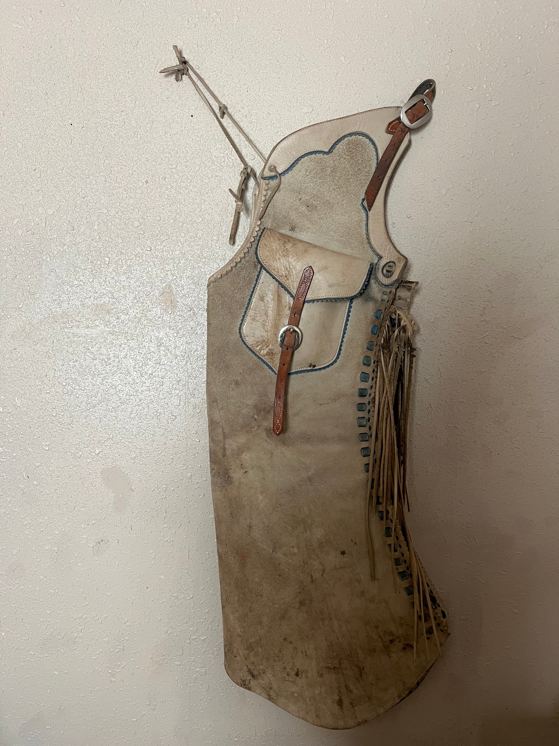 full step ins. Creme leg with blue pinking. Outside buckle pocket on left, inside pocket on right.